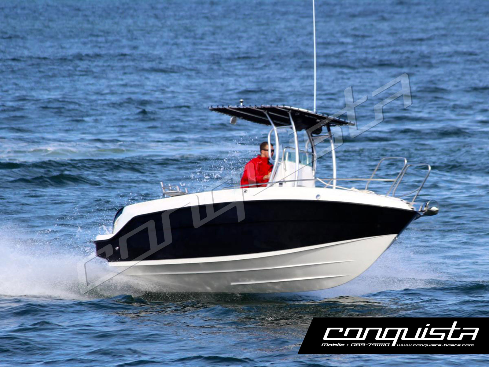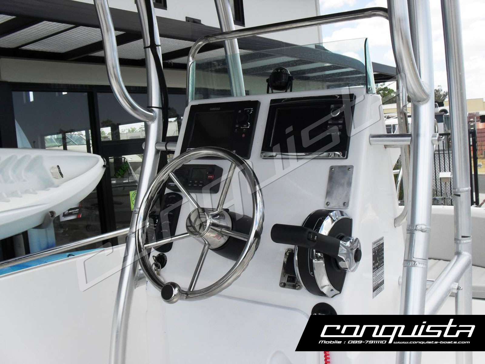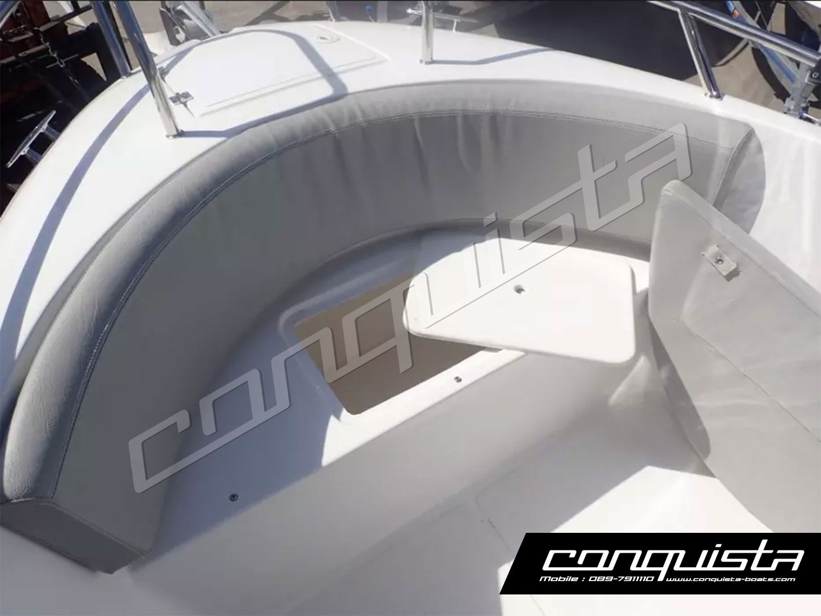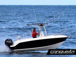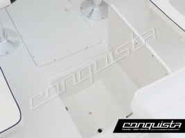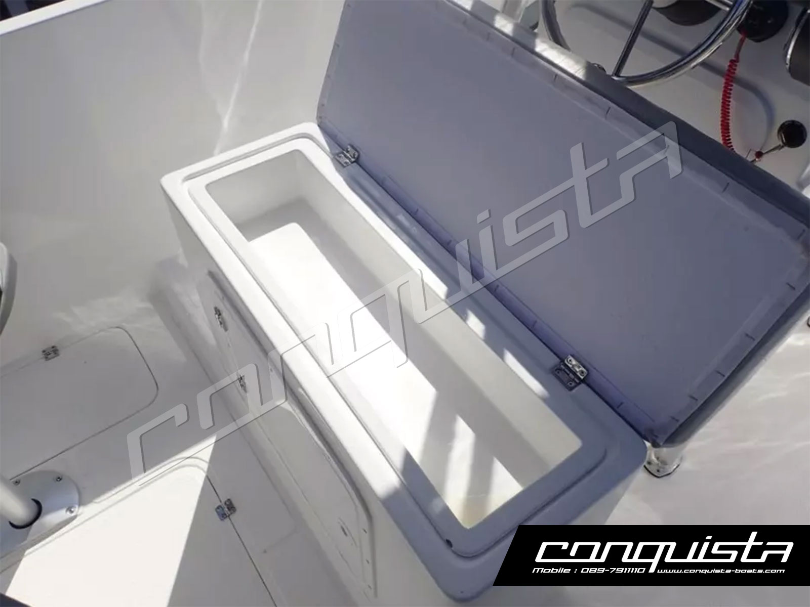 The CCC600 features an infusion molded, ultra-stiff and light-weight hull, fully functional 360 degree fishing action, a self-draining deck and a uniquely design aluminum T-Top with plenty of space for all your fishing gear. The floor-integrated storage/kill tank provides plenty of volume for your supplies or the catch of the day. The dashboard features plenty of space for additional instruments and a fish finder or MFD.